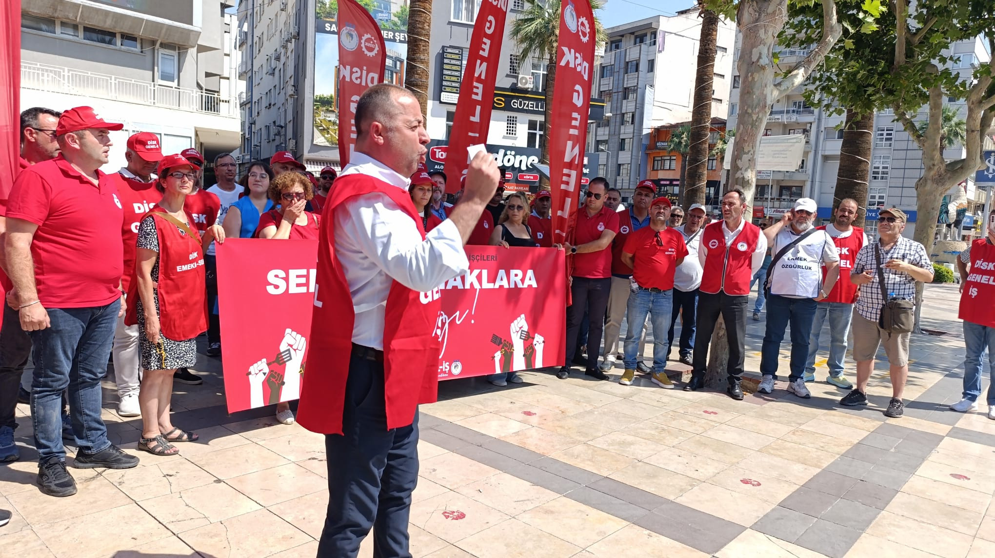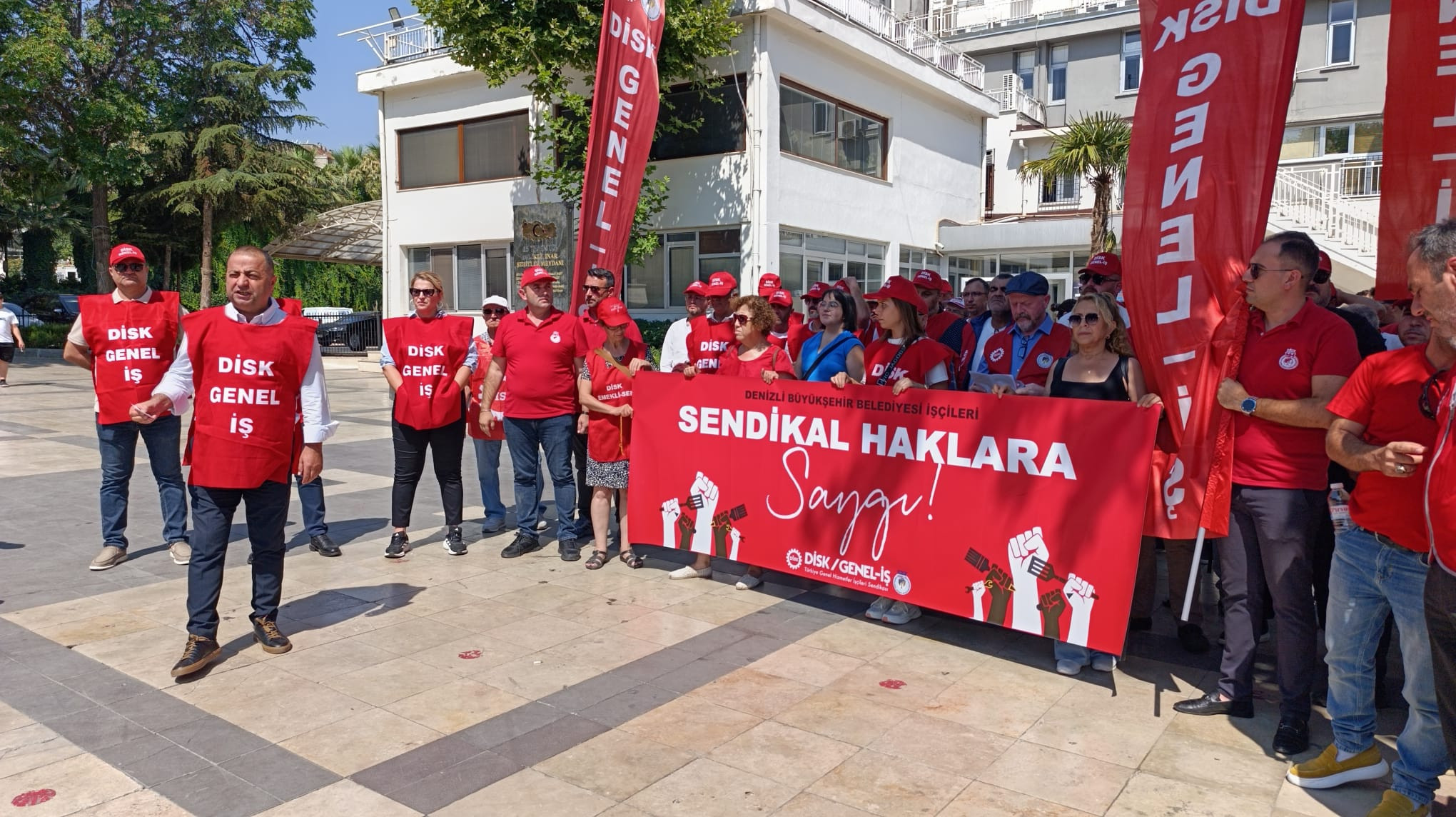 DİSK Genel-İş Sendikası, Denizli Büyükşehir Belediyesi’nde sendikal haklara yönelik baskıları protesto etti. Genel Başkan Yardımcısı Faruk Saral, belediye yönetimini hukuksuzlukla suçladı.